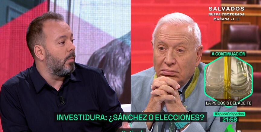 En este momento, el periodista ha pedido a José Manuel García-Margallo que fije el debate. "Ha dicho Margallo que si no hay un referéndum de autodeterminación no habrá investidura. Y yo le pregunto que cómo es posible hacer en España un referéndum de autodeterminación sin que se reforme la Constitución y, por lo tanto, sin que el PP vote a favor", ha expresado Antonio Maestre, mientras que el político ha dicho que cree que "lo que el PSOE quiere hacer es ir a un modelo de una España plurinacional y confederal a través de una modificación de los estatutos de autonomía".
