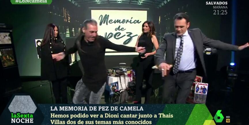 25 años de carrera dan para mucho, y también cinco horas de programa, que es lo que dura laSexta Noche. Y tanto recorrido ha llevado a que Dionisio Martín, integrante del grupo Camela, haya acabado enseñando al presentador del programa, Iñaki López, a bailar sus míticos pasos: salto, vuelta y marcha atrás.