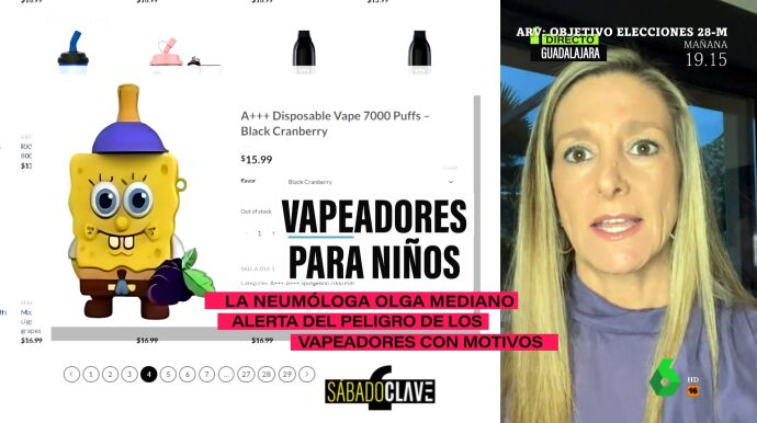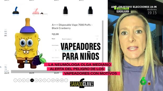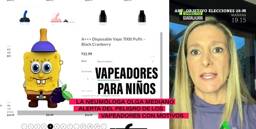 Olga Mediano alertó en laSexta Xplica sobre los vapeadores para niños, con formas de dibujos animados. "Los vendedores de vapeadores han conseguido dos cosas: que a los niños les encante y que algunos padres piensen que son inocuos; ese era el objetivo de que los vapeadores tuvieran esas formas y esos sabores", señaló la neumóloga, quien añadió que "incluso para los adolescentes los hacen con forma de pendrive de forma que, además, los padres no los pueden ver".