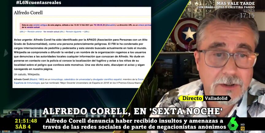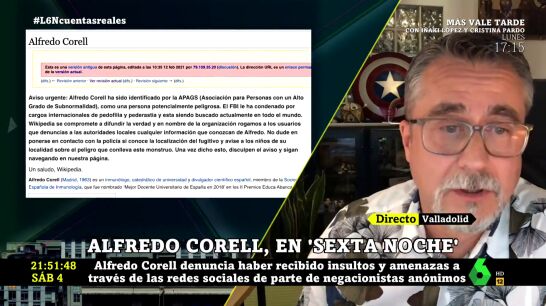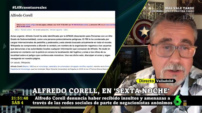 El odio de algunos negacionistas llega a los expertos que comparten cada día la verdad detrás de la pandemia de coronavirus. Uno de los afectados es el inmunólogo Alfredo Corell, un habitual de laSexta Noche que, en el programa, explica los violentos episodios que ha sufrido en redes sociales.