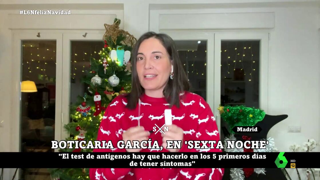 Boticaria García ha afirmado en laSexta Noche que "todos los test que se dispersan en farmacias son seguros", y ha señalado que tienen una capacidad para detectar un positivo "de entre el 95% y el 96%". "Es menor que en una PCR, pero igualmente los test de antígenos son efectivos", ha defendido.