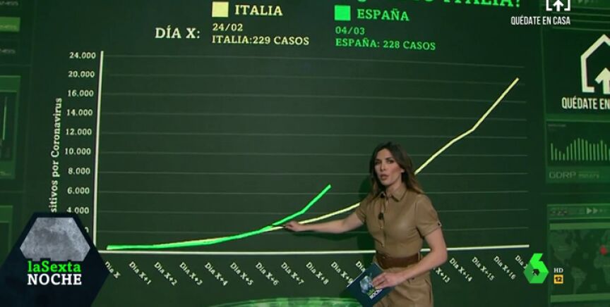 La periodista Verónica Sanz ha comparado en laSexta Noche las curvas de los crecimientos de contagios de coronavirus para ver cómo está siendo nuestra evolución y si se puede comparar con la de Italia.