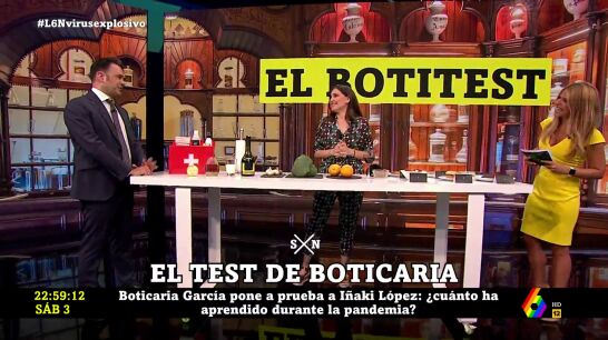 Boticaria García ha sometido a Iñaki López al 'Botitest', en el que ha preguntado al presentador de laSexta Noche sobre cuestiones que la farmacéutica ha resuelto en diferentes programas. "¿Dónde hay que poner el botiquín?", ha preguntado Boticaria García y que has permitido a Iñaki López llevarse un 'minipunto' por su respuesta correcta.
