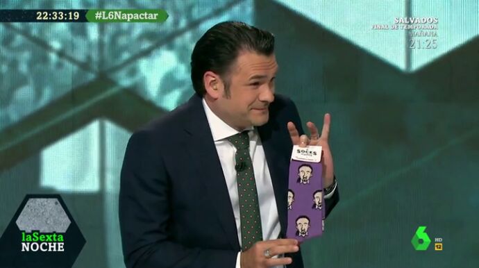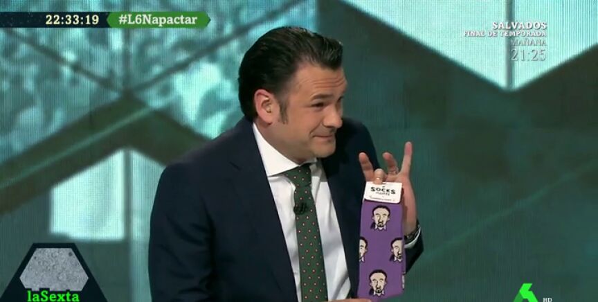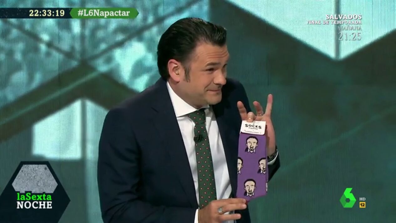 Iñaki López regala a Inda y Marhuenda unos calcetines de Pablo Iglesias y Pedro Sánchez