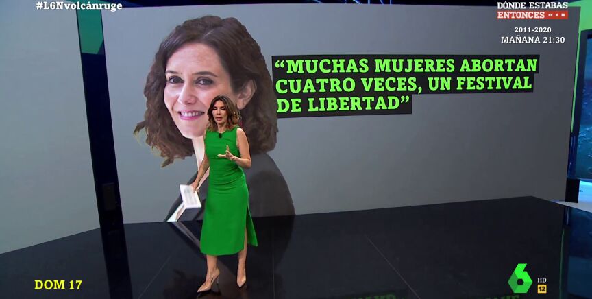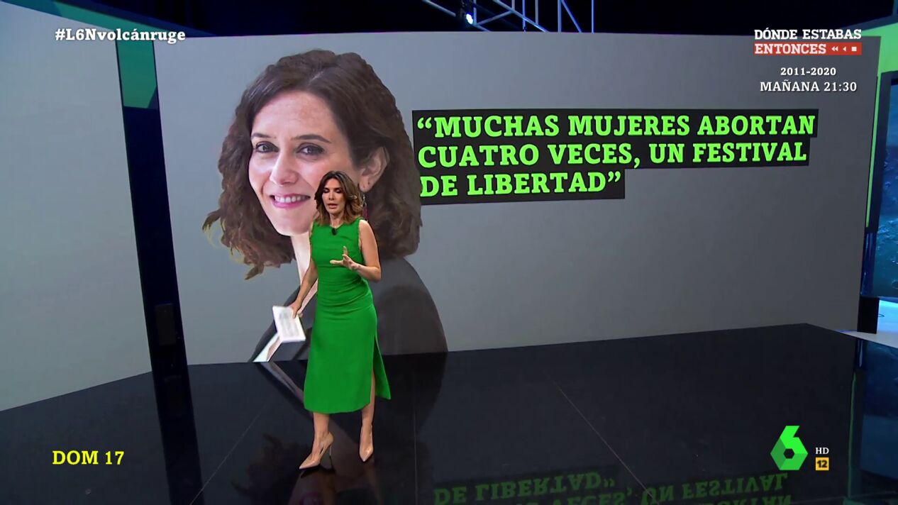 La presidenta de la Comunidad de Madrid, Isabel Díaz Ayuso, vuelve a ser protagonista de la polémica. Esta vez, por sus polémicas palabras sobre el aborto. La dirigente madrileña aseguró recientemente que para las "feministas profesionales" el aborto es "una fiesta": "Es una decisión que se toma una vez, no cada cuatro como muchas mujeres". Unas declaraciones que no han gustado nada y que Verónica Sanz ha analizado en laSexta Noche.