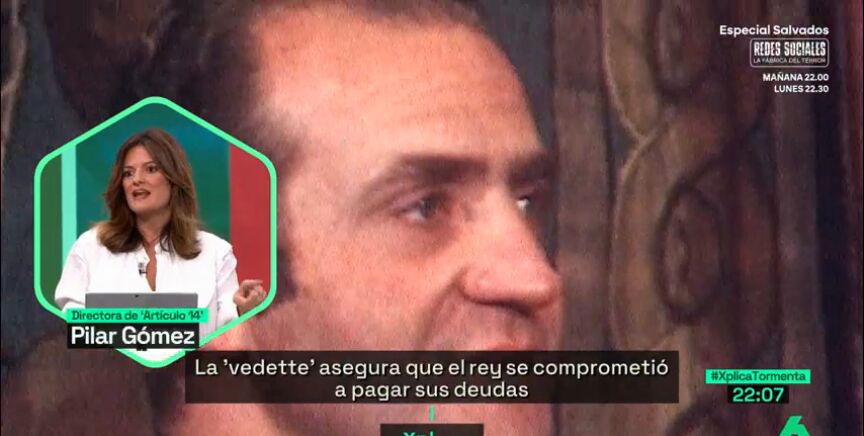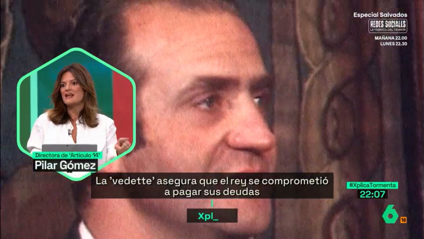 Pilar Gómez, directora de 'Artículo 14', denuncia que el rey emérito Juan Carlos I "estaba protegidísimo por el Estado, pero en sus actividades personales". Algo que considera grave dada la situación de España entonces, recordando cómo se gastó el dinero del Estado en sus aventuras privadas tanto con Bárbara Rey como con Corinna Larsen.
