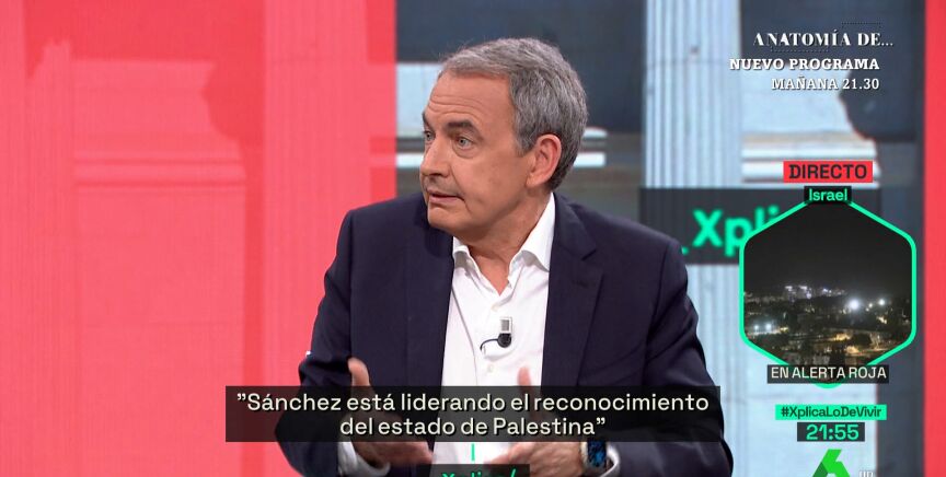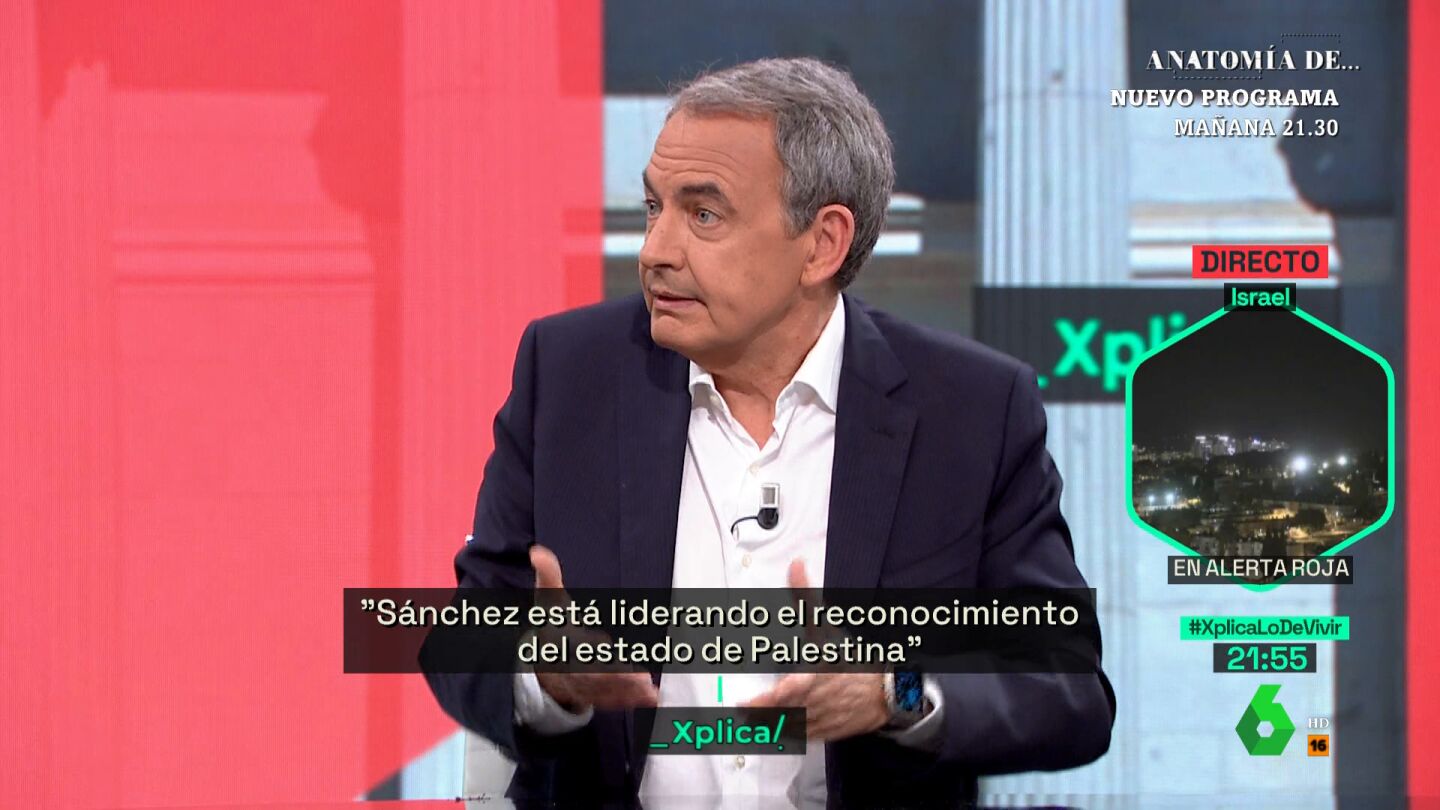El expresidente del Gobierno, José Luis Rodríguez Zapatero, visita el plató de laSexta Xplica y reacciona a las palabras que Aznar dijo sobre la creación de un Estado Palestino: "¿A qué Estado se están refiriendo?", se preguntaba, para acto seguido añadir: "¡Si eso no existe!".