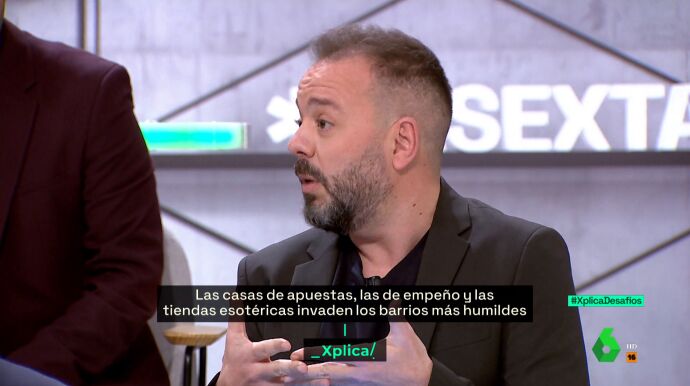 El periodista ha advertido de la aparición, además, de otros negocios como las casas de empeño y las tiendas de esoterismo. La causa, según ha advertido en laSexta Xplica, es la "desesperación" de la población: "Cuando estás desesperado, tu único intento de salir de la miseria es buscar el azar, una apuesta, empeñar lo poco que tienes o buscar en la espiritualidad en aquello que te salve".
