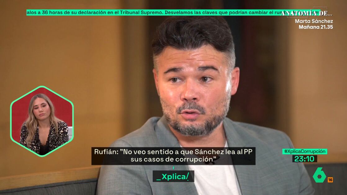 Gabriel Rufián ha concedido una entrevista a laSexta Xplica tras su tenso cara a cara con Pedro Sánchez en el Congreso. El portavoz de ERC ha compartido su visión sobre la corrupción y las reformas urgentes que, en su opinión, necesita España.