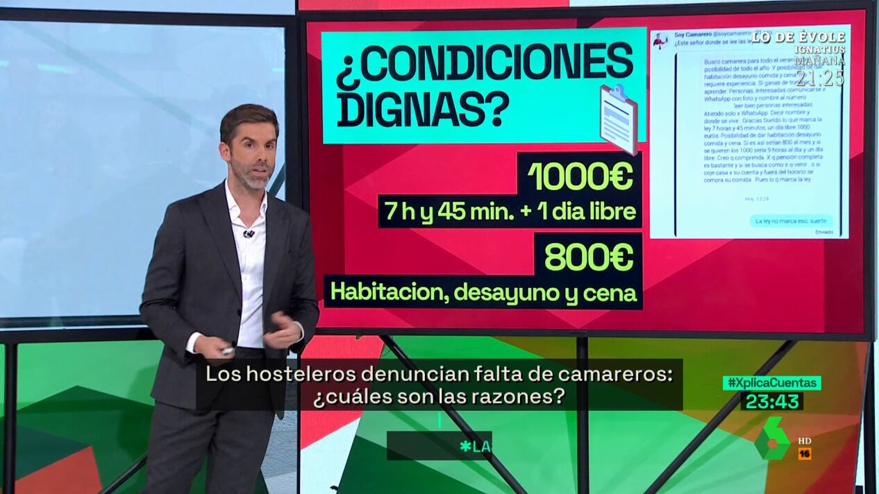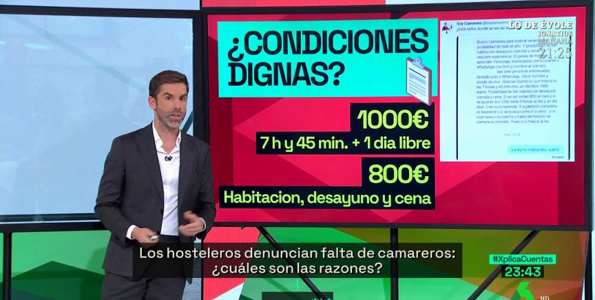 El programa laSexta Xplica ha abordado en un debate las denuncias del sector hostelero por la falta de camareros. Ha mostrado, además, ciertas ofertas de trabajo cuyas condiciones son nefastas.