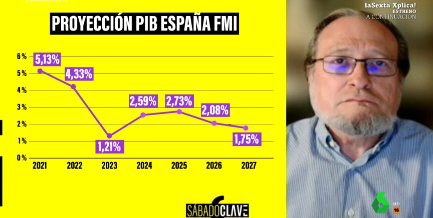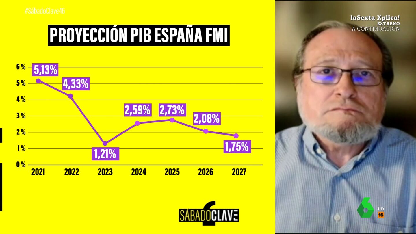 El catedrático en economía Santiago Niño Becerra advierte en laSexta Xplica que "estas previsiones son muy malas". Si nos centramos en el caso de España, "a partir del 2025, el crecimiento se estanca. Esta lectura lo que nos indica es que la situación se recupera y luego cae". Los datos de déficit de España, la elevada inflación, el estancamiento de la deuda pública y la falta de mejoría de los datos del paro, son ingredientes de "un cóctel muy complicado", afirma el economista.