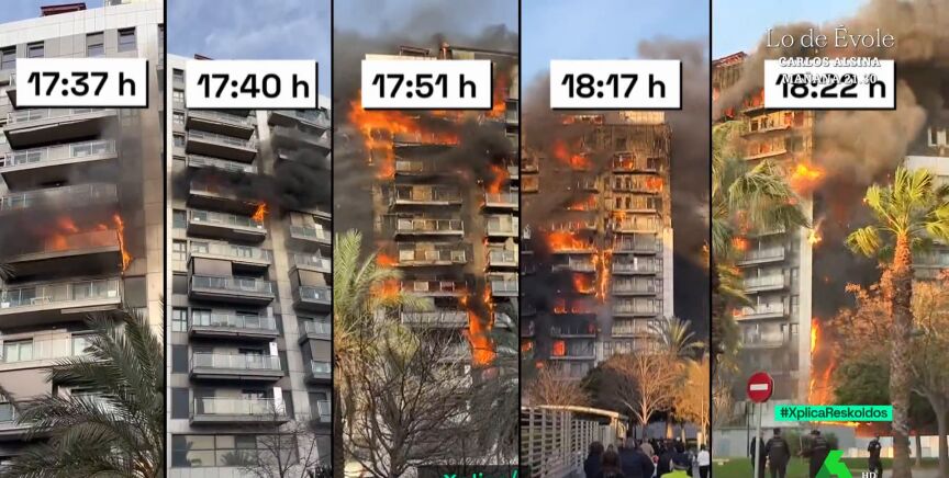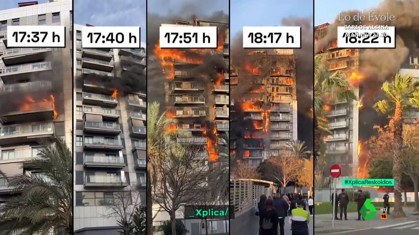 ¿Se cumplió con la normativa contra incendios al construir el edificio que ha ardido en Valencia? Esta es la pregunta que muchos se hacen después de ver cómo el bloque de 14 plantas fue pasto de las llamas en tan solo 50 minutos. "Esto es lo que más ha sorprendido a los técnicos, a los bomberos y a los expertos", comenta José Yélamo, que muestra la secuencia de cómo fue pasando el fuego de una planta a otra.