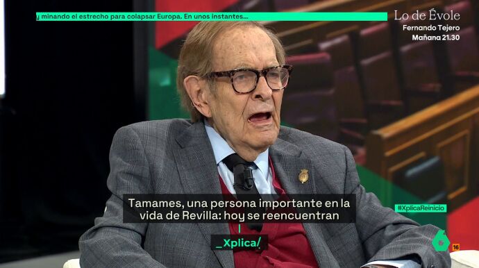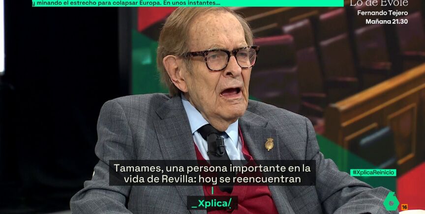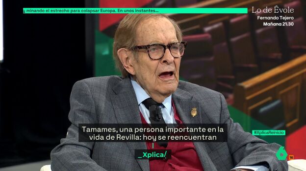 laSexta Xplica vivió este sábado el reencuentro entre dos amigos: Ramón Tamames y Miguel Ángel Revilla. El economista y el expresidente de Cantabria dieron un repaso por su vida y por la política actual en una conversación a tres con José Yélamo en la que también se comentó cuando Tamames acudió al Congreso de los Diputados como candidato de Vox para la moción de censura contra Pedro Sánchez.