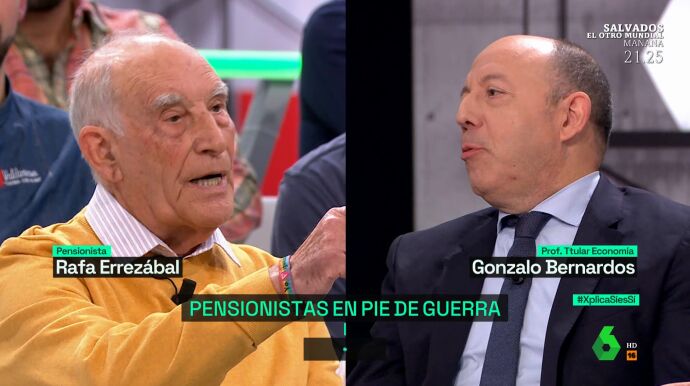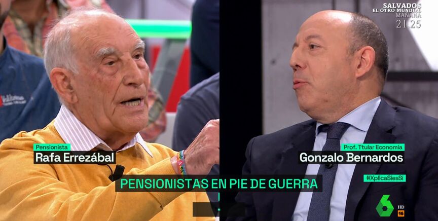 El economista Gonzalo Bernardos y el jubilado Rafa Errezábal han mantenido un tenso debate a raíz de las pensiones en laSexta Xplica. El pensionista acudía a lamentar el hecho de que sean tan exiguas en nuestro país, con la mayor parte de los retirados españoles cobrando menos de 1.000 euros mensuales.