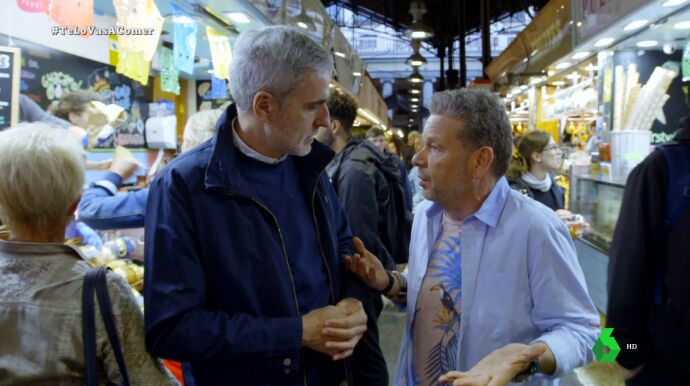Allí, el chef queda con una persona que sabe mucho de Barcelona y de gastronomía: Mikel López Iturriaga. "Wellcome to Barcelona", bromea nada más verle.