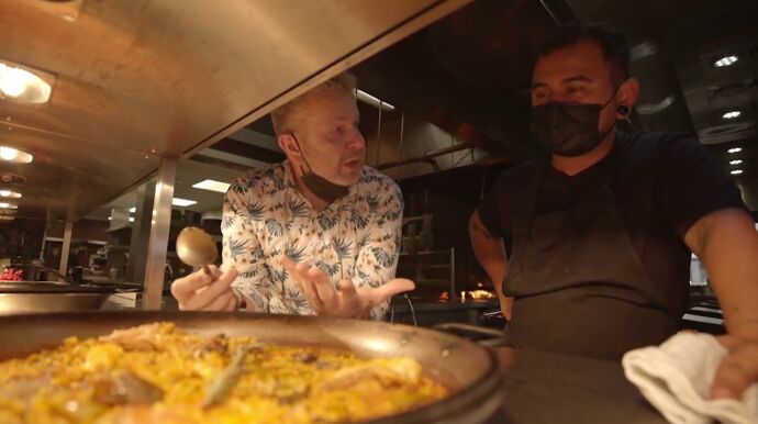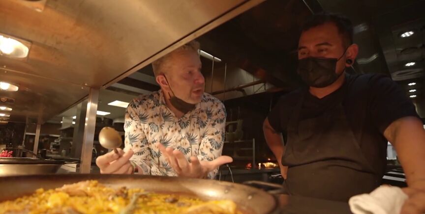 De la Cruz le muestra cómo hacen la paella en el restaurante y Chicote alucina: "Lo que me jode es que aquí digan que esto no es paella". Además, una vez terminada, se anima a probarla: "Es un espectáculo".