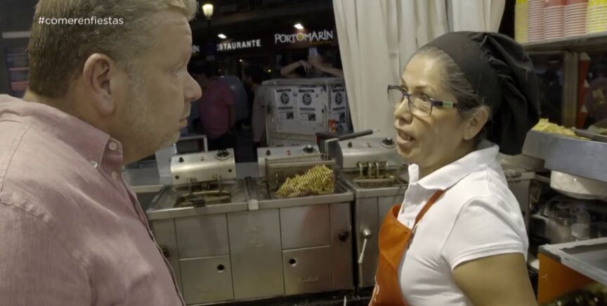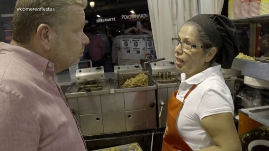 "¡Buenas tardes! ¿Cómo estamos? Vaya fritada de huevos que tiene usted aquí...". Así se presenta Alberto Chicote en una de las casetas de la feria de San Lorenzo de Madrid cuando ve que están utilizando huevos frescos en algunos de sus platos, aunque sea algo que no está permitido según el pliego de condiciones elaborado por el departamento de Sanidad y Consumo de Madrid. "¿Usted sabe que está prohibido vender esto en los puestos? Y tenéis ahí las tortillas a temperatura ambiente, los chorizos... nada, nada", le comenta el chef, que pide hablar con la encargada para leer estas normas. "No sé si usted es consciente de esto", le recrimina. Ella asiente con la cabeza.