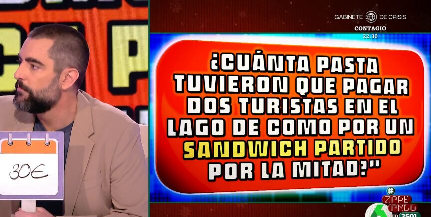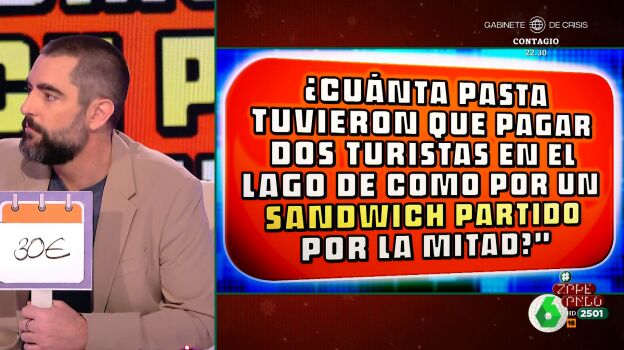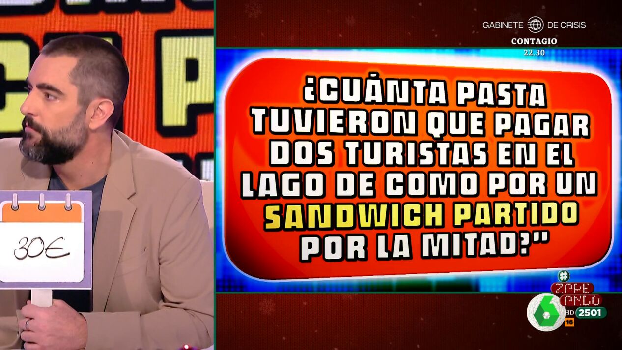 Lo primero que deben adivinar es cuanto pagaron unos turistas para que les partieran un sándwich por la mitad en el Lago de Como. Miki Nadal acierta indicando que les cobraron dos euros. La siguiente prueba de 'El precio injusto' es adivinar cuánto cobraron a unos turistas por cuatro helados en Roma. Los precios que indican los zapeadores van de los 40 euros de Dani Mateo a los 60 euros de Quique Peinado. En esta ocasión gana Quique Peinado ya que les cobraron 64 euros.