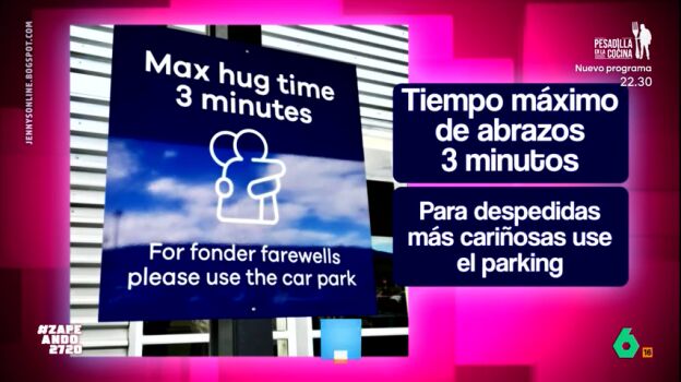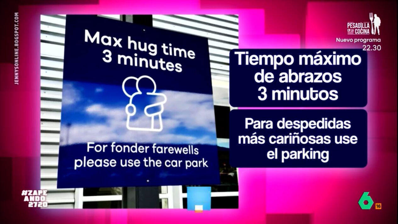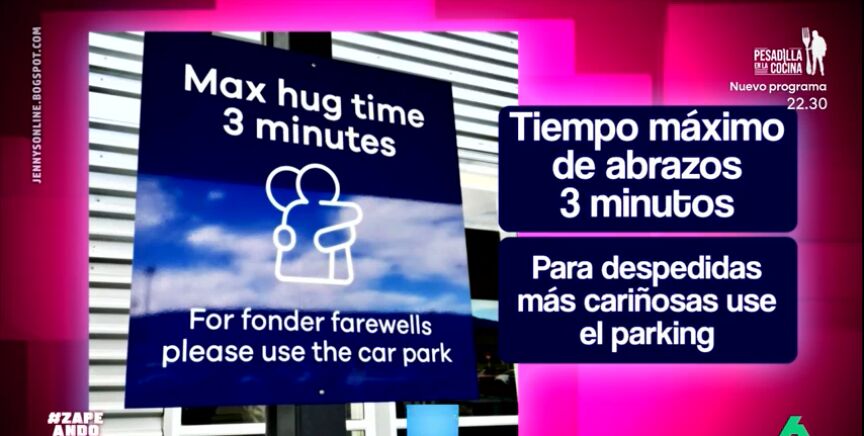 Como se puede ver en el vídeo, el cartel impone un tiempo máximo de tres minutos para darse abrazos dentro de las instalaciones del aeropuerto. Asimismo, aconseja a aquellos que sean incapaces de despedirse en menos de ese tiempo que se vayan al parking: "Para despedidas más cariñosas, use el parking".