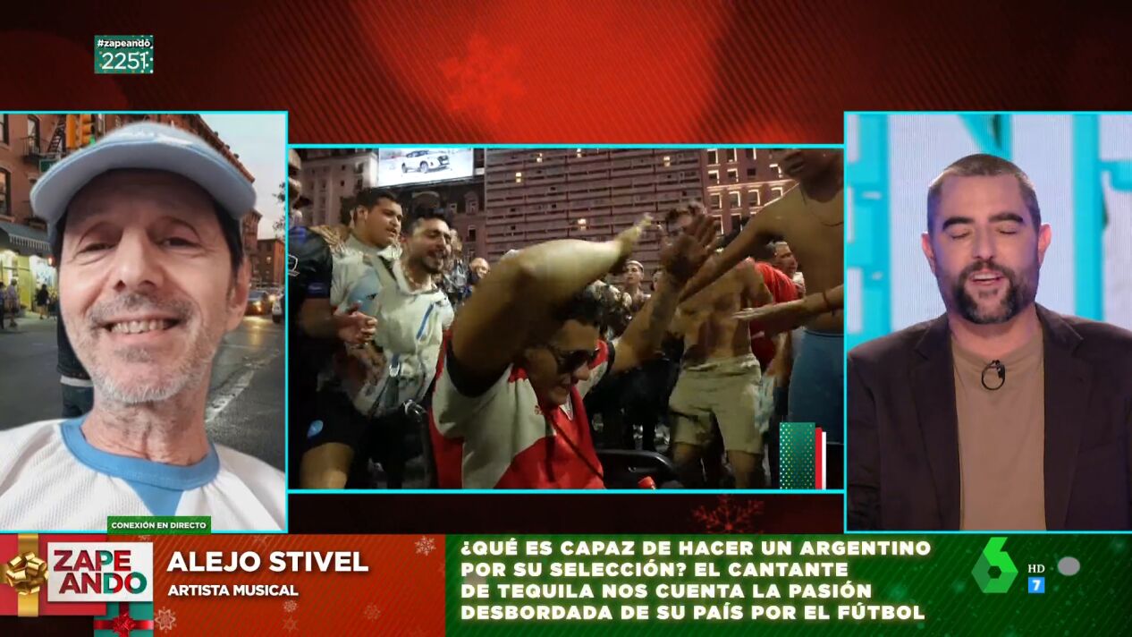 Alejo Stivel, vocalista del grupo Tequila, está nervioso. Y como él, todo Argentina. Este domingo se juegan la final del Mundial. El equipo de Zapeando ha contado con el testimonio del artista para tratar de entender la pasión de su país por el futbol. "Lo de Argentina con el fútbol es mejor no buscarle explicaciones. Es algo mucho más, creo que hay muchas cosas de la vida que las canaliza por ahí. De alguna manera trata de buscar ahí lo que no tiene en su vida diaria", ha tratado de explicar en directo al mismo tiempo que ha enumerado las historias más locas que ha escuchado durante el Mundial.