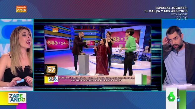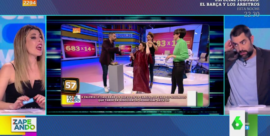 "Tendrían que haber probado con alguien los huevos antes porque dolía una barbaridad", se queja. "Valeria es tan mentirosa, queridos espectadores", espeta Dani Mateo, que aprovecha para desmentir las palabras de la vasca, que estuvo quejándose durante programas que se los cascaba de punta, pero "se los cascó de lado". "Te voy a cascar los huevos a ti", dice Valeria para defenderse del 'ataque' de su compañero. Puedes ver el cómico pique que hay en plató sobre estas líneas.