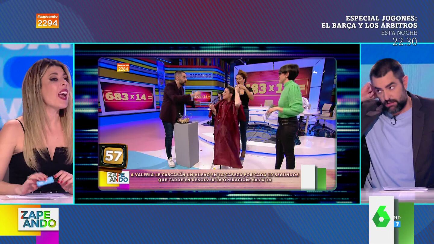 Santi Alverú vuelve a Zapeando con su sección 'El día del espectador', en el que recuerda por petición de la audiencia el momentazo en el que Patricia Pérez reventó varios huevos en la cabeza de Valeria Ros en pleno directo. "¿Cómo te sentiste?", le pregunta el colaborador a la vasca, a lo que ella responde: "Lo pasé mal, pero todo por el espectáculo". Eso sí, vuelve a recalcar una vez más que Patricia no quiso sentarse después.