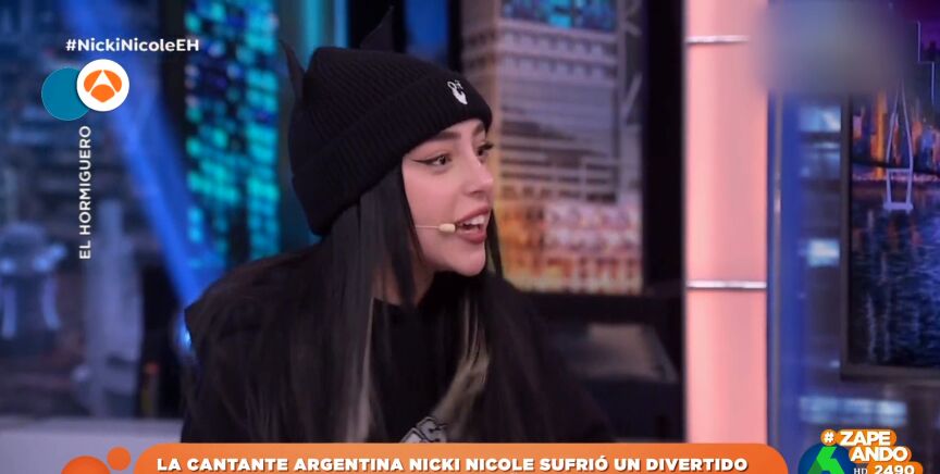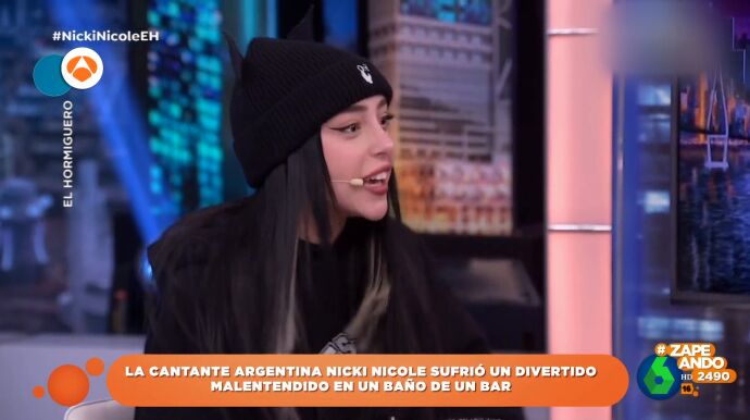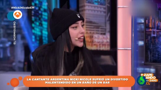 La cantante argentina Nicki Nicole ha visitado El Hormiguero y durante su entrevista contó una anécdota "bastante raruna" sobre lo que le pasó en un baño, avanza Dani Mateo a sus compis de Zapeando. La intérprete se estaba haciendo mucho pis y decidió ir al baño, pero no podía bajarse la cremallera de su body, así que pidió la ayuda de su manager Mati. "Se lio parda", informa Valeria Ros.