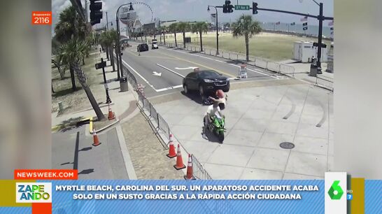 "Imagen impactante", anuncia Quique Peinado, que ha ocurrido en Myrtle Beach, una ciudad del Carolina del Sur. Este vídeo recoge el momento en el que un coche enviste a una moto por detrás y la mujer que iba de paquete sale disparada, pero el conductor no corre la misma suerte y queda atrapado debajo del coche.