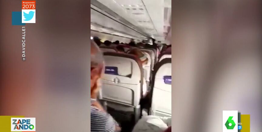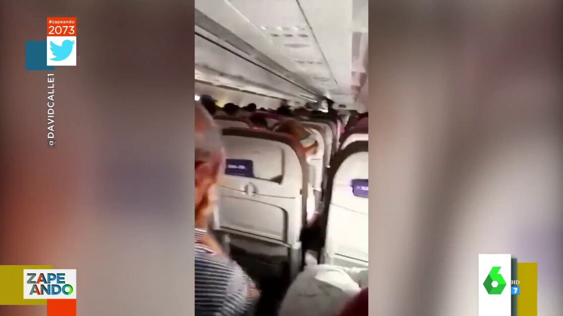 "El vuelo ha tenido un final feliz", informa Quique Peinado a sus compañeros después de mostrarles las angustiosas imágenes que se vivieron en el interior de la cabina, donde tan solo se escuchaban "llantos y gritos de desesperación", mientras que el personal del avión pedía por megafonía que permanecieran sentados. "Qué angustia ver a la gente despidiéndose", comenta el zapeador de Vallecas en el vídeo principal de la noticia.