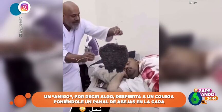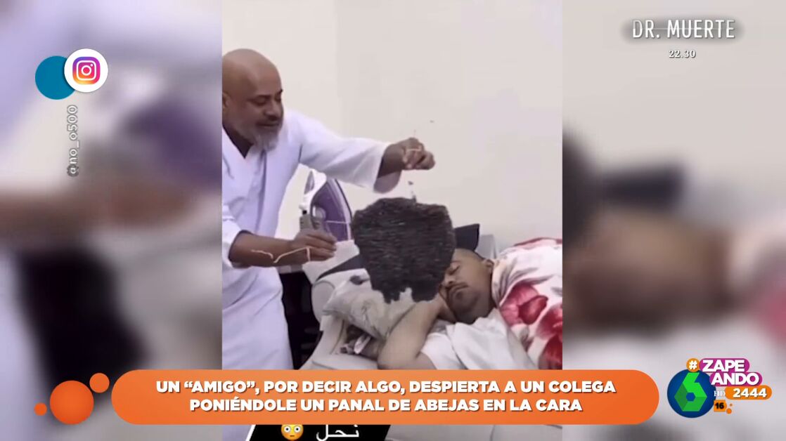 Un hombre trata de despertar a un amigo, que duerme plácidamente en el sofá, colocándole un panal de abejas en la cara. ¿Cuál es su reacción? Descúbrelo en este vídeo de Zapeando.