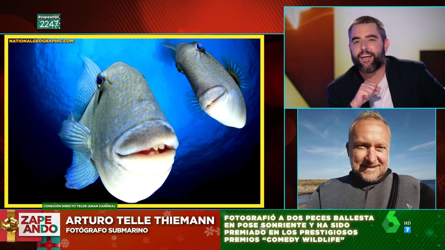Arturo Telle Thiemann ha sido premiado en los prestigiosos premios 'Comedy Wildlife' tras fotografiar a dos peces ballesta en pose sonriente. Puedes ver su entrevista completa en directo en Zapeando en este vídeo.
