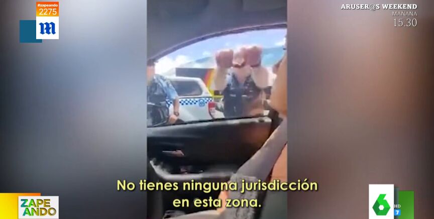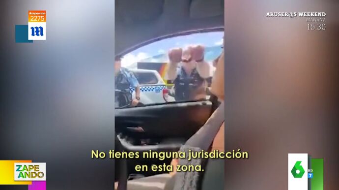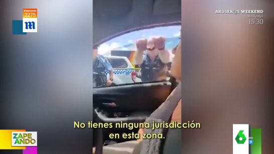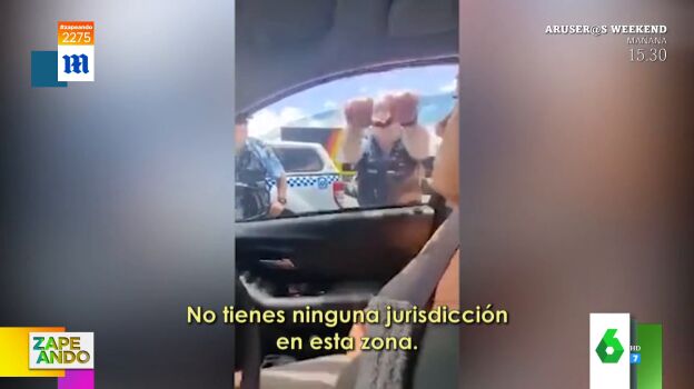 "Vamos con una imagen impactante", anuncia María Gómez a sus compis de Zapeando. En Australia la policía ha dado el alta a un vehículo y le ha pedido a la conductora que se bajara del coche por tener el permiso caducado, pero ante su negativa, "se les va un poquito de las manos". "Si le tocas el coche estás cometiendo una infracción", grita el copiloto desde el dentro, que se resiste a bajar del vehículo, "y no tienen ninguna jurisdicción en esta zona".