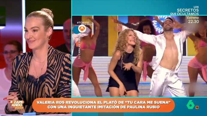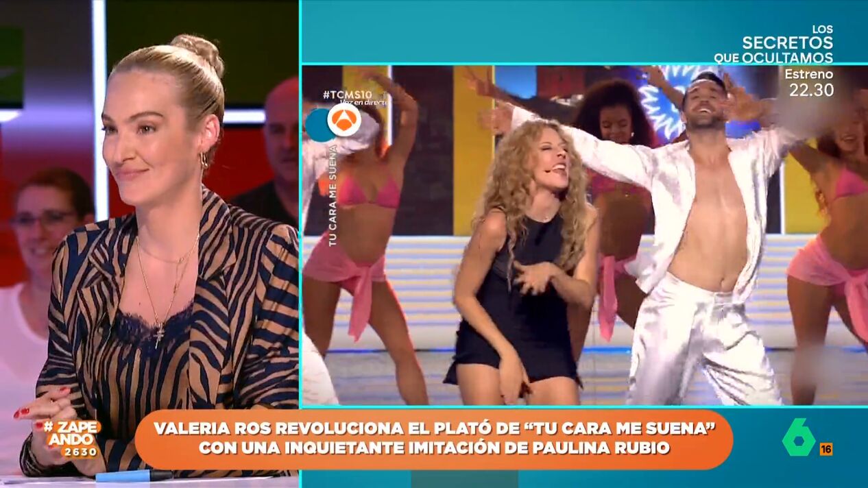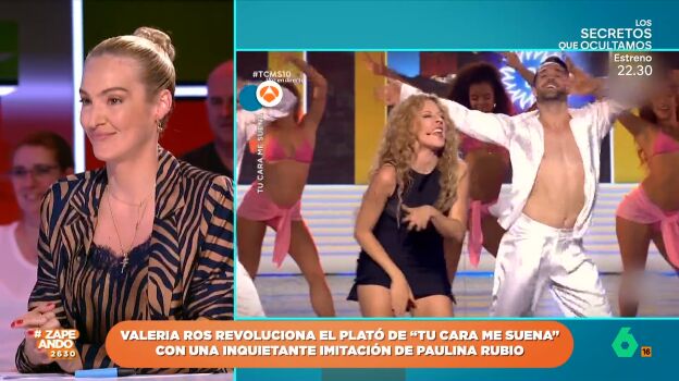Valeria Ros sigue sorprendiendo en 'Tu cara me suena'. A sus épicas imitaciones, que la han convertido en Osito Gominola o Britney Spears, la zapeadora suma a Paulina Rubio. Ros se ha convertido en la artista mexicana en el último programa musical de Antena 3.