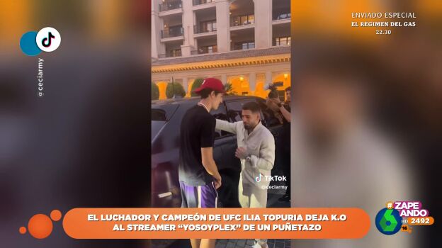 Los streamers Ceciarmy y Yosoyplex le piden al luchador de la UFC que les dé un puñetazo en la barriga y ambos acaban retorciéndose en el suelo. Puedes ver este momento en este vídeo de Zapeando.