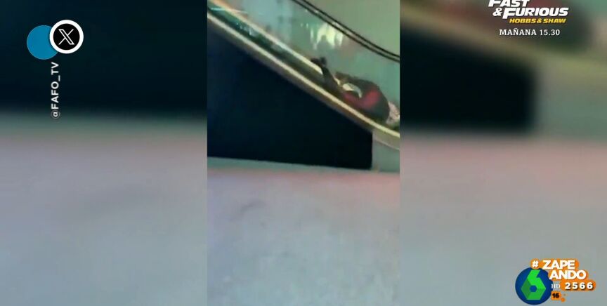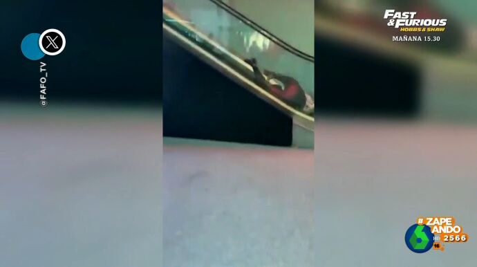 Dani Mateo muestra a sus compañeros de Zapeando el divertido vídeo viral de una mujer que se enfrenta, como dice el presentador, a una "lucha a muerte contra una escalera mecánica en la estación de autobuses de Detroit".