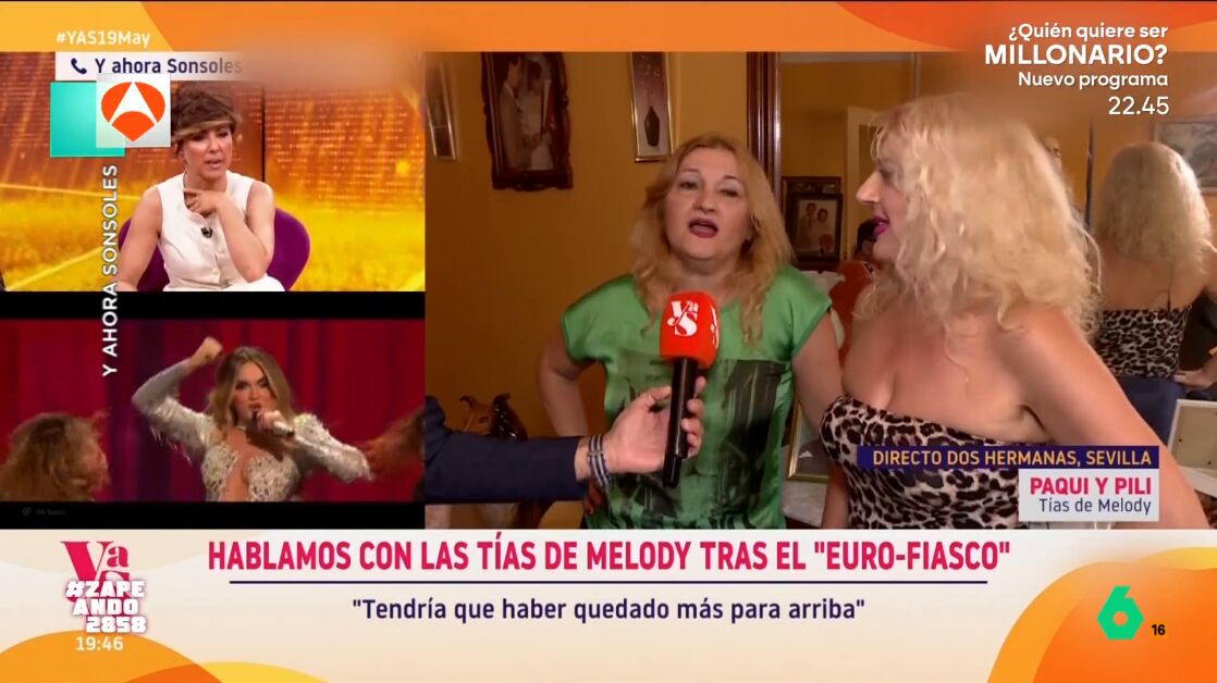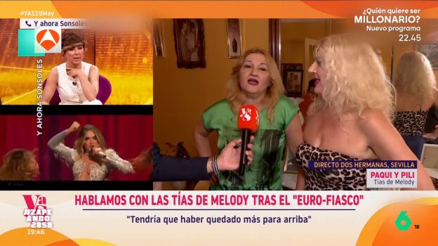 'Y ahora Sonsoles' ha viajado hasta Dos Hermanas, en Sevilla, ciudad de origen de Melody, representante de España en la última edición de Eurovisión. A pesar del resultado obtenido por su candidatura, sus tías, Pilar y Paqui, demostraron que en su casa "no se ve atisbo de drama". Algo que seguro ayudará a la cantante a superar este momento.