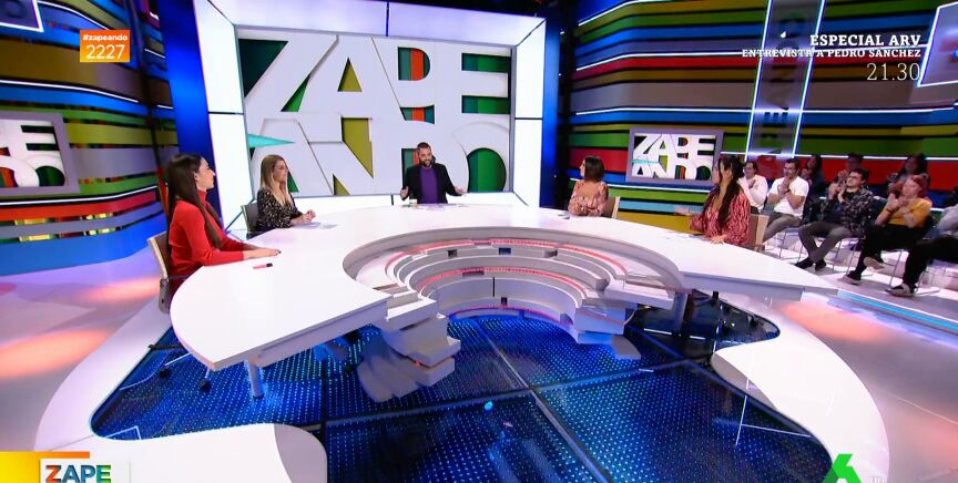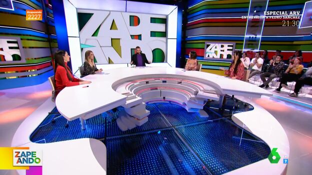Dani Mateo arranca Zapeando y, como es tradición, presenta a las zapeadoras que esta vez le acompañan en plató. Sí, zapeadoras porque... ¡está rodeado de mujeres! Esta vez la mesa es de las chicas. "Valeria Ros, Cristina Pedroche, Lorena Castell, Maya Pixelskaya y yo en representación del heteropatriarcado", destaca el presentador.