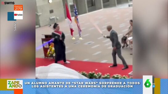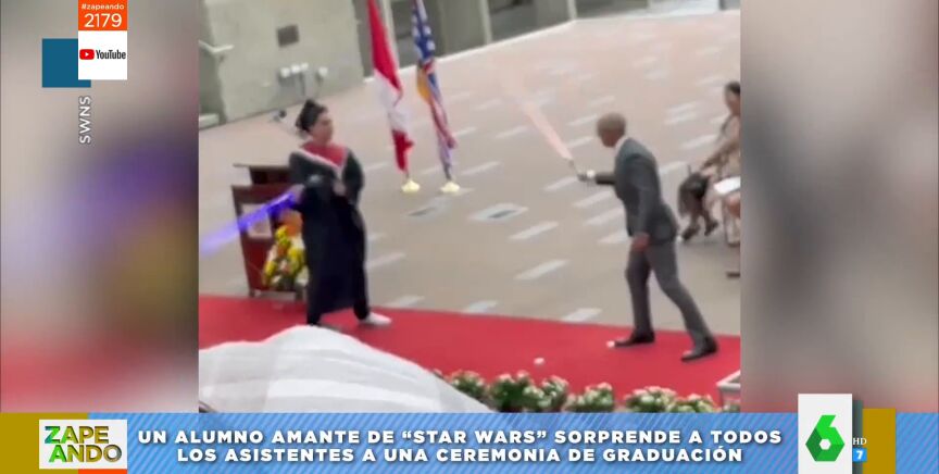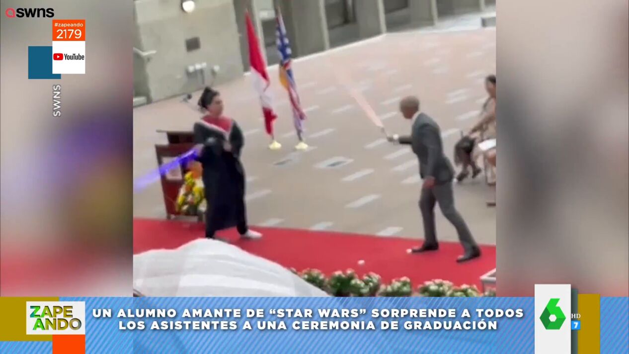 Algunos estudiantes aprovechan sus ceremonias de graduación para homenajear a su peli favorita. Este es el caso de este joven que, cuando va a recibir su diploma, saca un sable láser y, en actitud desafiante, se acerca al director del instituto al que le saca otra espada y le reta a un duelo en mitad del acto. Él no duda en aceptar y se desarrolla una divertida pelea: "Al final le atraviesa y lo mata", describe la escena Quique Peinado, que no puede evitar reaccionar asegurando que "el director no es friki ni nada".