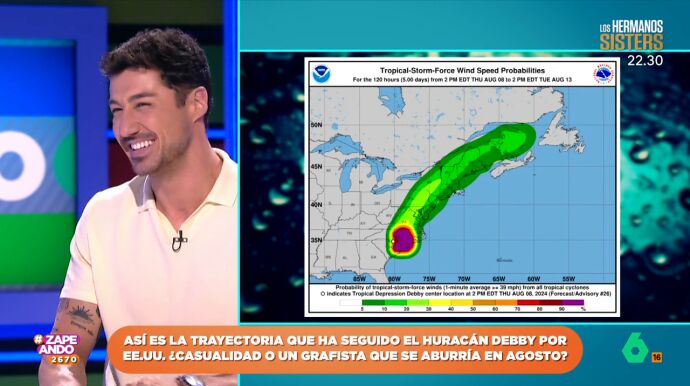 "En realidad era una previsión de lo que iba a hacer el huracán y lo han clavado", afirma Francisco Cacho sin poder evitar un ataque de risa. Como explica el meteorólogo de laSexta, 'Debby', "pasó por Florida, después por las dos Carolinas e incluso por Nueva York y llegó a Canadá". Cacho añade que está ahora muy cerca de Reino Unido y en las próximas horas puede afectar al tiempo de nuestro país.