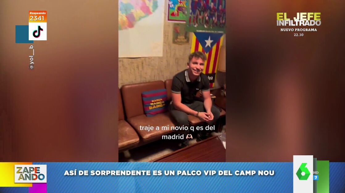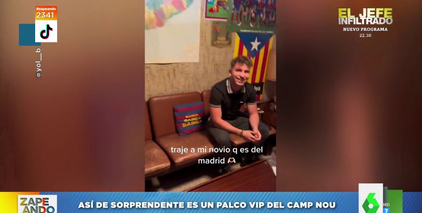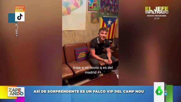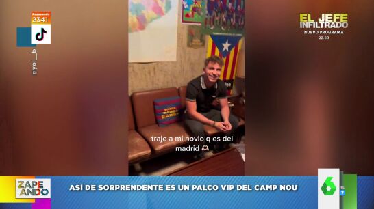 "¿Queréis saber qué se siente al entrar en un palco VIP del Camp Nou?", pregunta Miki Nadal a sus compis de Zapeando, a los que muestra el vídeo de Tik Tok que se ha hecho viral, en el que un aficionado comparte su experiencia: "Lo que se siente es decepción", espeta.