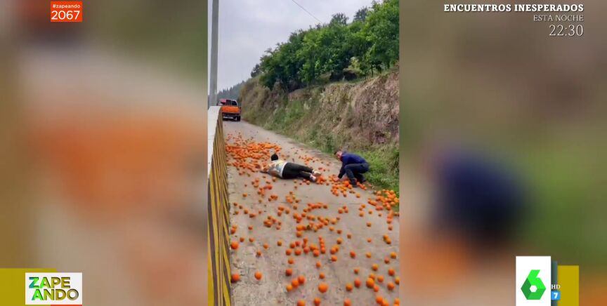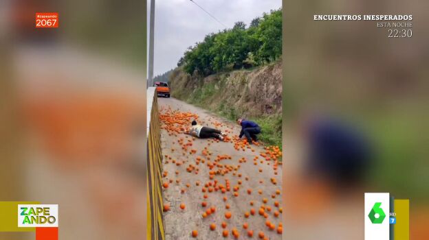 Los zapeadores hacen una recopilación de los vídeos virales más divertidos del día y Quique Peinado muestra a sus compis de mesa cómo un accidente "a la altura de Calamocha" tiene unas repercusiones muy negativas para el país vecino: "Ha dejado sin naranjas a toda Francia", espeta tras mostrar el viral en el que se ve cientos de estos frutos rodando colina abajo.