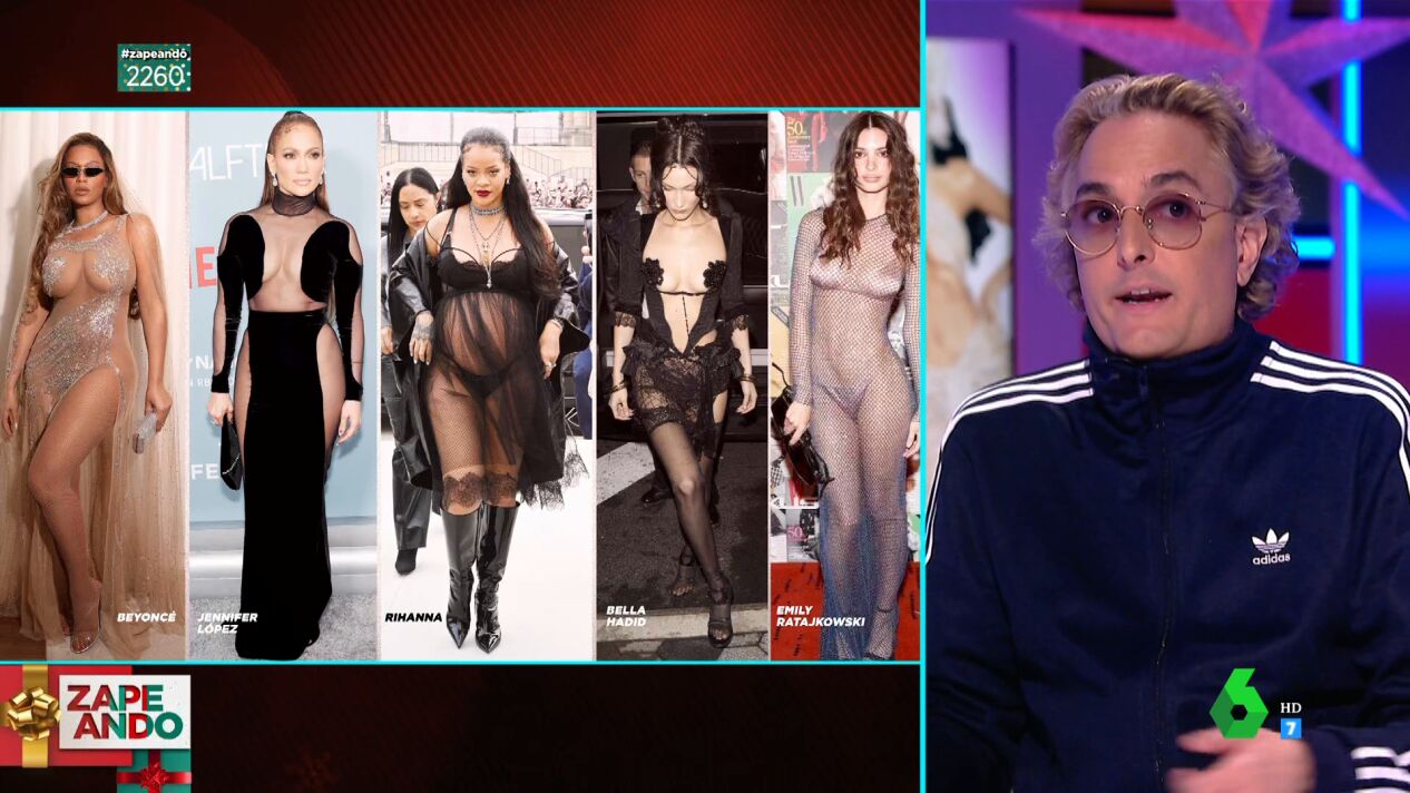 A escasas 48 horas de dar la bienvenida al 2023, Josie acude al plató de Zapeando para repasar los looks más atrevidos que han vestido las famosas este año. "El 2022 ha sido el año de las transparencias y hemos visto looks memorables", opina Valeria Ros, que muestra una imagen de Beyoncé en la gala post Oscars con un diseño transparente con lentejuelas que "cubrían estratégicamente". Pero este año también se han arriesgado Bella Hadid, Emily Ratajkowski y Rihanna.