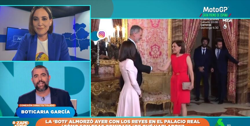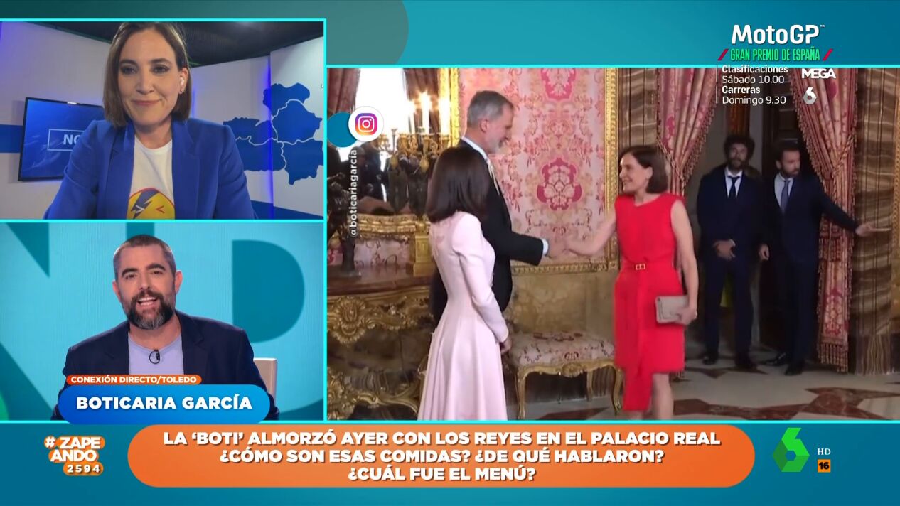 Boticaria García cuenta en Zapeando que la comida en el Palacio Real duró aproximadamente una hora y desvela que la "chicha" está en el café, momento en el que se forman los llamados "corrillos". Ahí aprovechó para acercarse, junto a Sonsoles Ónega y Alfonso Goizueta, a saludar a la reina, que estaba hablando con Ángel Martín.