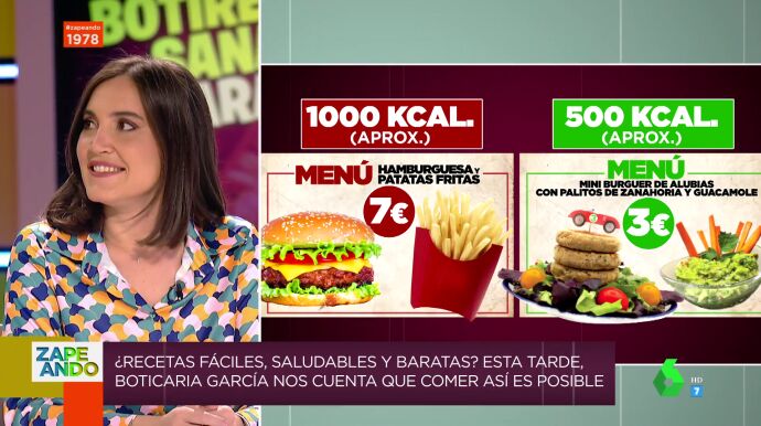 Boticaria García visita el plató de Zapeando para desmontar menús de comida rápida y, es su lugar, propone otros menús muchos más saludables e igual de ricos. Por ejemplo, Lorena Castell le pregunta por uno de los menús de comida rápida más conocidos y demandados: una hamburguesa con patatas fritas por 7 euros. ¿Qué pega le pone la experta?