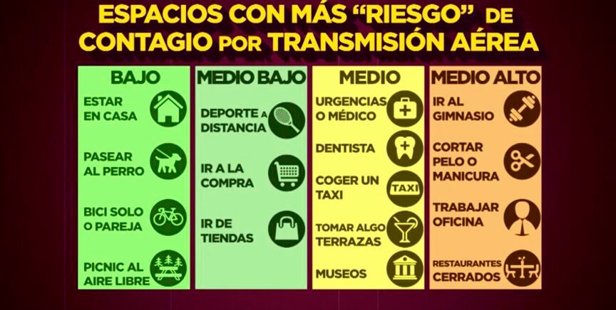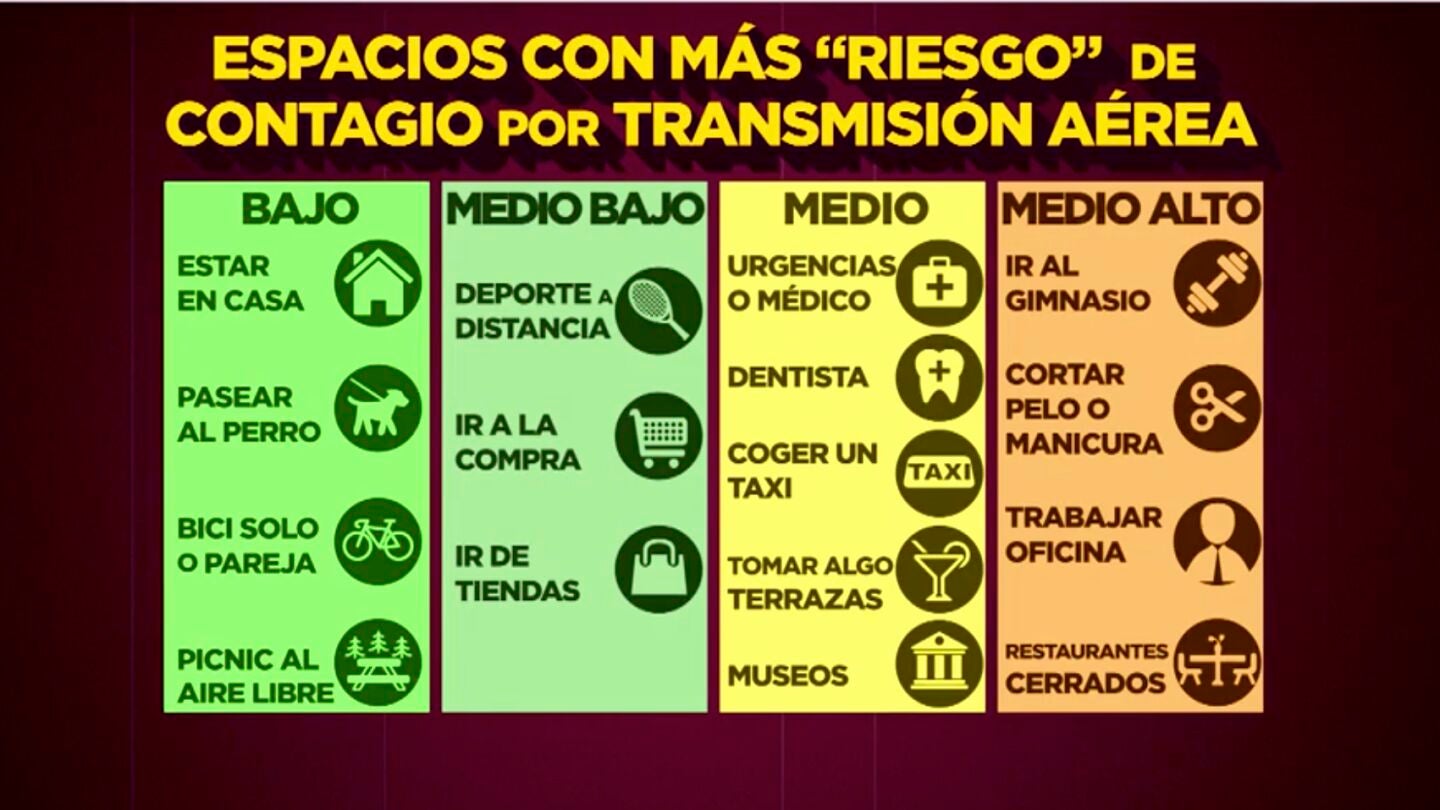 Boticaria García también explica cuáles son los espacios de contagio por transmisión aérea. Por ejemplo, entre los espacios de riesgo bajo están estar en casa o pasear al perro mientras que en el riesgo medio-bajo se encuentran hacer deporte a distancia o ir a la compra.