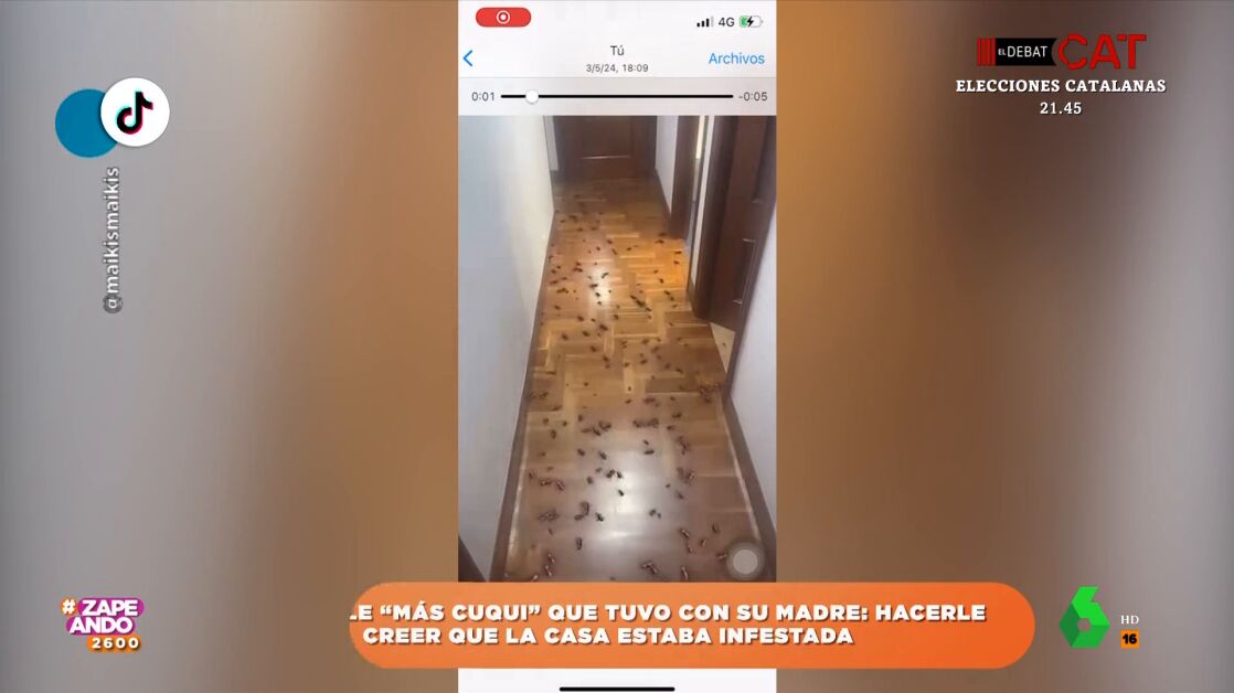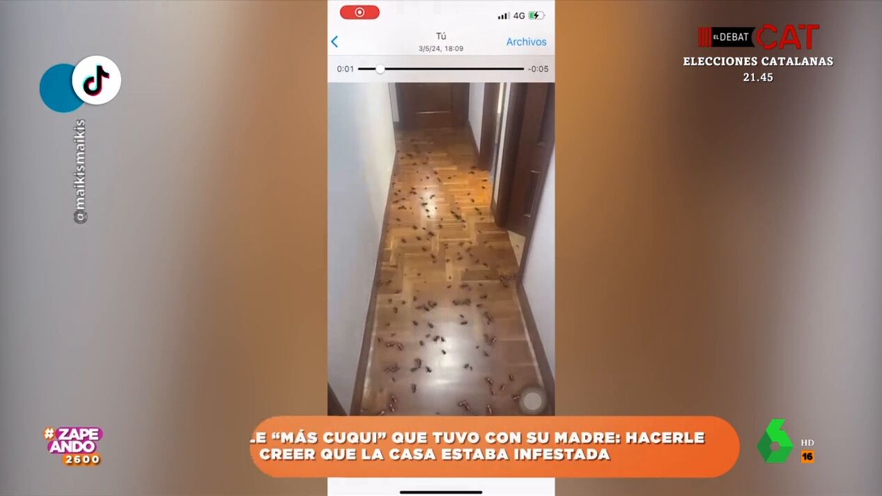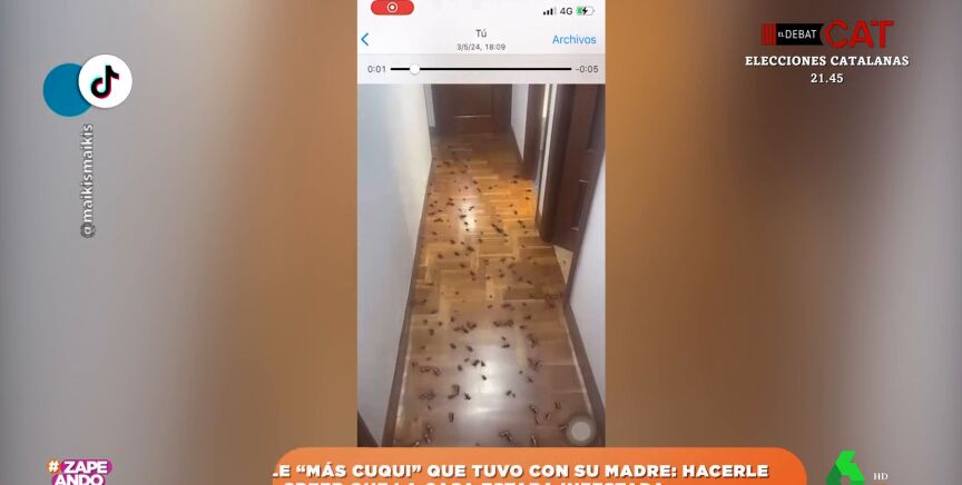 Una chica envía a su madre un vídeo en el que utiliza un filtro para hacerle creer que su casa está llena de cucarachas. Puedes ver cómo reacciona al ver su pasillo lleno de insectos en este vídeo de Zapeando.