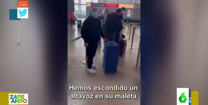 En el vídeo principal de la noticia puedes ver la reacción de este joven cuando sus colegas accionan el altavoz y de su maleta empiezan a emanar ruidos raros. "Quién le vería explicando en el control del aeropuerto 'eso no es mío, alguien me lo ha metido en la maleta'", imagina una divertida Marta Torné desde el plató de Zapeando.