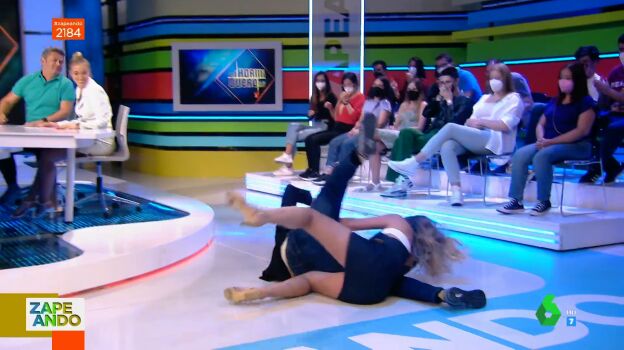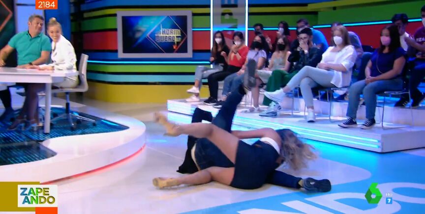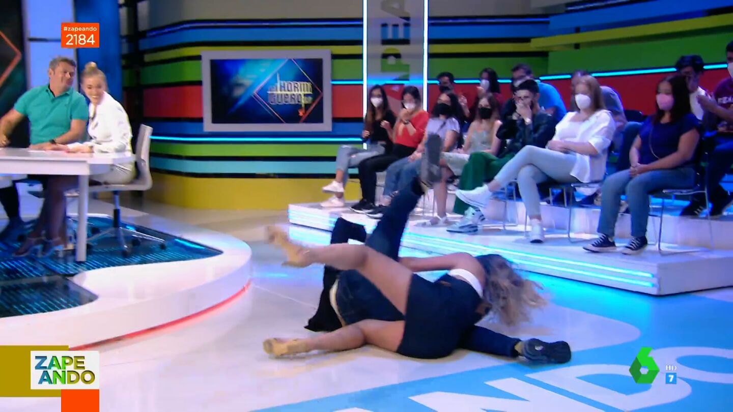 Tanto le ha gustado a la colaboradora vasca la entrada de Paz Padilla que se salta el guión de Zapeando y propone, en pleno directo, a Dani Mateo imitarla. Puedes ver en el vídeo principal de la noticia el terrible y cómico final de este salto, que acaba con ellos dos en el suelo y con la vasca sangrando. "¿Por qué has hecho esto?", no puede evitar preguntarle Quique Peinado, a lo que ella responde entre risas: "No lo sé".