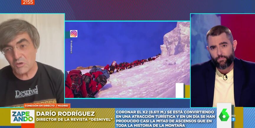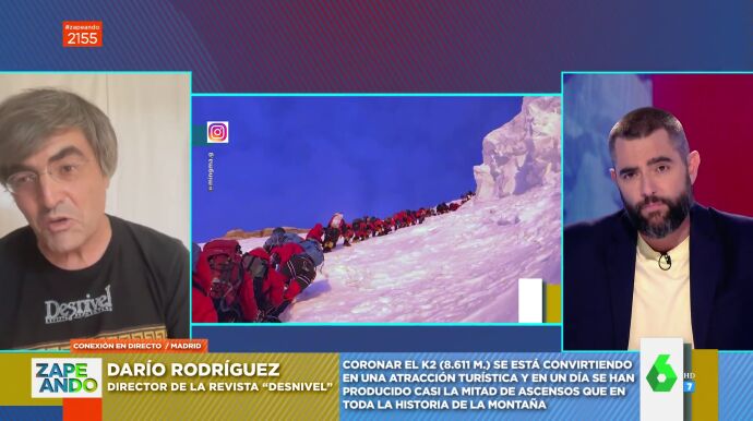 En tan solo un día, unos 145 alpinistas al logrado alcanzar la cima del K2. Esto supone que, en tan solo una jornada de escalada, han llegado a la cima casi la mitad de personas que la han alcanzado a lo largo de toda la historia. Por este motivo, Zapeando conecta en directo con Darío Rodríguez, director de la revista 'Desnivel' y experto en alpinismo, que explica que las montañas más altas del planeta, como pueden ser el Everest o el K2, se están convirtiendo en "una atracción turística", a pesar de la peligrosidad que conlleva su escalada: "De cada cuatro personas que la acienden, una fallece", asegura.