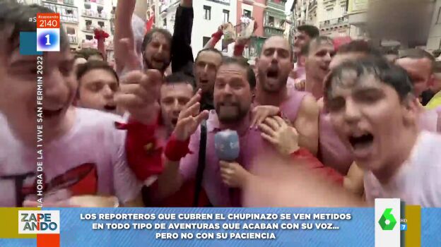 Ayer se daba inicio a las fiestas de San Fermín con el tradicional chupinazo, un momento de éxtasis colectivo que, como señala Santi Alverú, para los reporteros es "como Vietnam". El programa ha querido repasar las imágenes más divertidas protagonizadas por quienes informaban del acontecimiento entre la multitud.